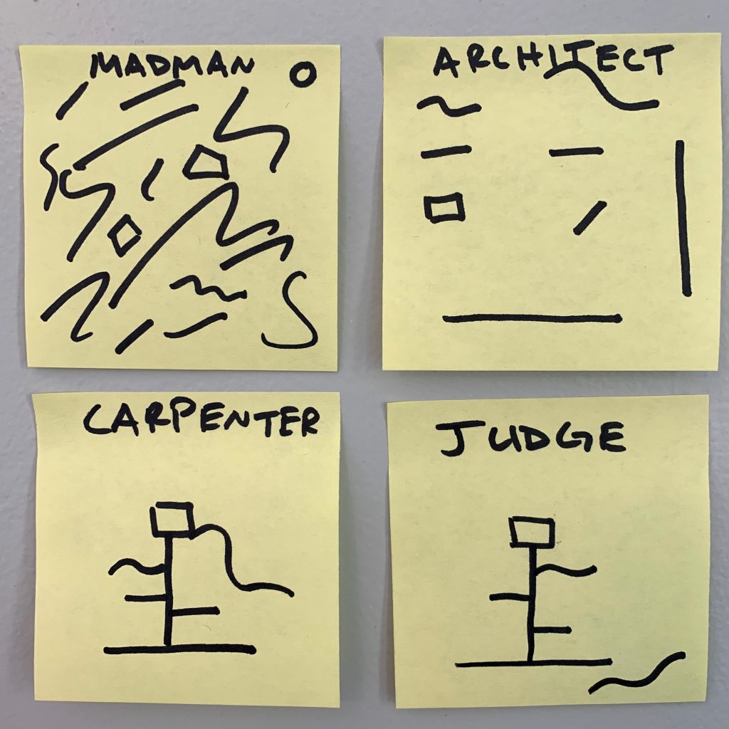 The madman generates all the ideas. The architect organizes and chooses whats needed. The carpenter puts it together. The judge refines and pollishes.