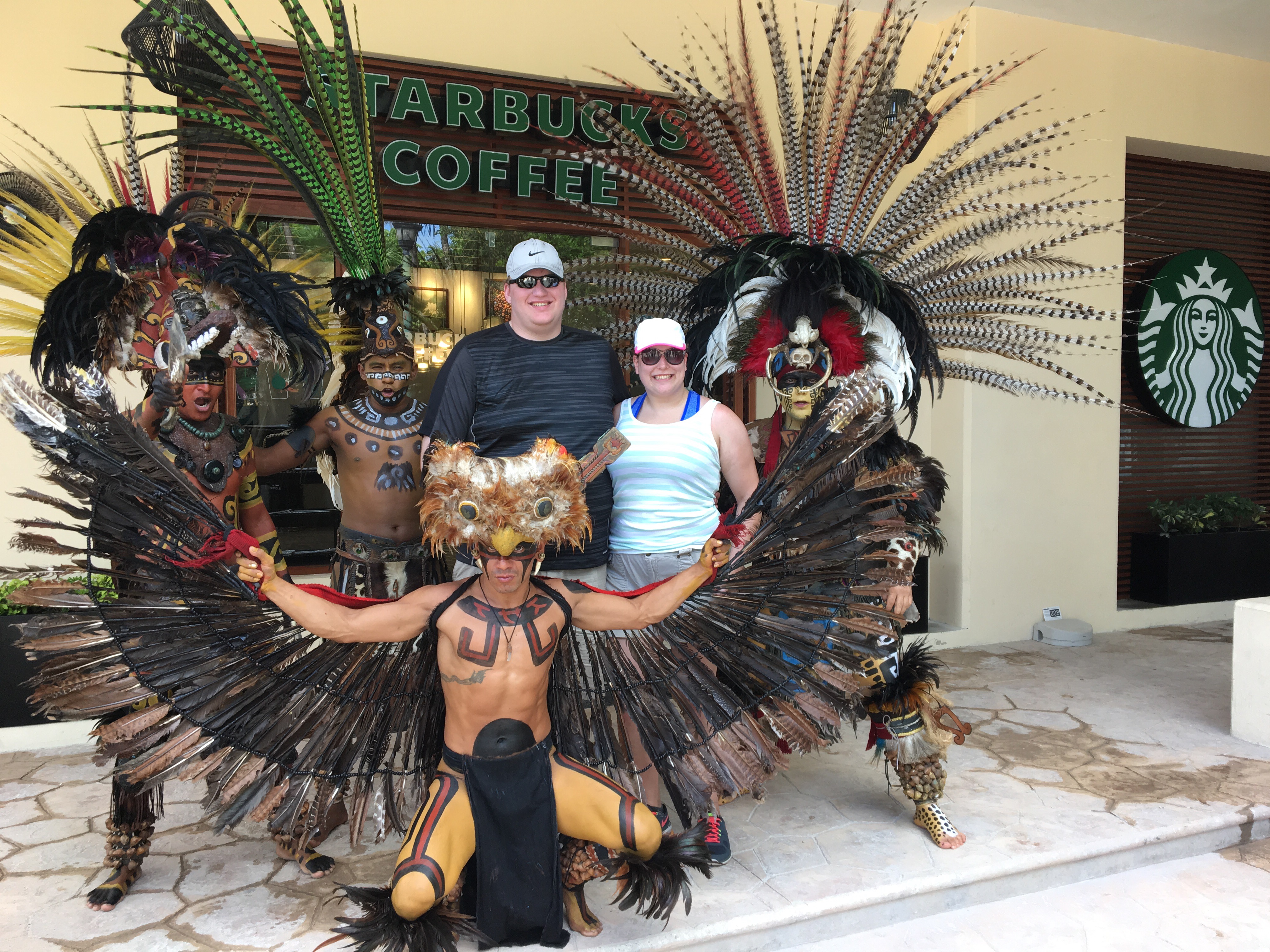 This was a picture from my recent vacation in Cancun. My brother and his fiancé took a picture with Mayan impersonators and they chose this as their background (StarBucks) in the heart of a small city while waiting in line for a ride into Tulum.